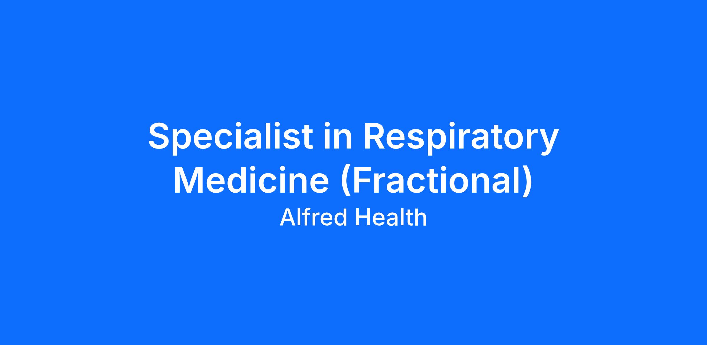 Applications are invited for the position of Specialist in Respiratory Medicine (Fractional), for a 0.1 EFT (3.50 hours per week) position and will primarily involve telehealth to Bairnsdale.